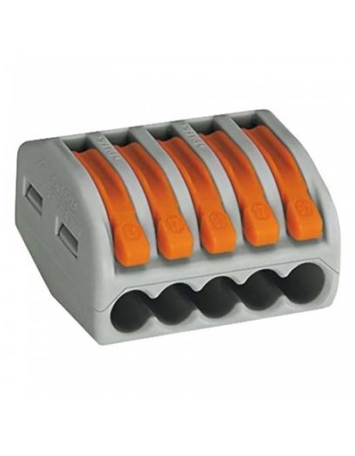 Пружинные клеммы WAGO серии 222 до 32 Ампер для соединения медных проводов Соединительные клеммники с зажимом захватывает до 5 зачищенных тонкопроволочных проводников от 0,08 мм2 до 4 мм2, одножильные и многожильные до 2,5 мм2. Для соединения алюминия, необходимо использовать токопроводящую пасту. Весь электромонтаж соединений происходит без инструментов - быстро, легко и надежно. Применения компактных соединительных клеммников Ваго 222 серии: С помощью клемм Ваго серии 222 подсоединяют проводники для подключения светильников, люстр, жалюзи, ставней, дверных приводов и т.д. Поднять оранжевый рычажок перпендикулярно клеммнику, тем самым открывается вводное отверстие клеммы. Ввести проводник со снятой изоляцией, примерно на 10мм, во входное отверстие клеммы и опустить рычажок в исходное положение. Самопроизвольное отсоединения таким образом становится невозможным. Технические характеристики зажима соединительного безвинтового: Количество контактов: 5 Сечения соединяемых проводников: от 0,08 до 2,5 кв.мм одножильные и многожильные; от 0,08 до 4 кв.мм тонкопроволочные. Номинальной напряжение: 400В/4кВ. Номинальный ток: 32А для 4 кв.мм / 24А для 2,5 кв.мм.